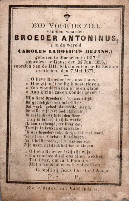 Geprofest te Ronse op 7.9.1863 als Broeder Ludgerus