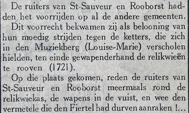 ■ 't Volk van Ronse schrijft in 1924 over een verdwenen ritueel te Louise-Marie waar de ruiters van St-Sauveur en Roborst rond het schrijn reden.