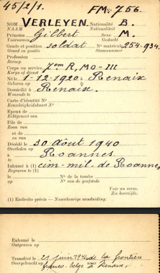 °Ronse, 1.12.1920 en +Roanne (Fr), 30.8.1940. Zoon van Gentil Verleyen en Maria Spileers. Begraven op het oud-kerkhof te Ronse.