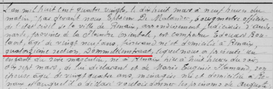 “…Pascal Joseph Regibo, agé de vingt huit ans docteur en medecine né et domicilié à Renaix quatrième section, Plaine St Pierre lequel nous a présenté un enfant…..” (1887)